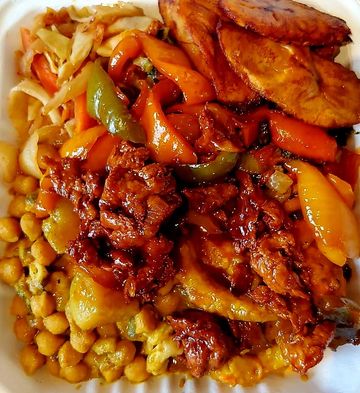 Our daily menu includes four options of base such as (Quinoa, Brown Rice, Rasta-Pasta and Split Peas Roti). There are variety of daily stews to choose from such as (Curry Chickpeas, Eggplants Stew, Callaloo, Sauté Cabbage, Curry Cauliflower, Stir-Fry Vegetables, Ital Stew and Pumpkin Stew etc..). Each meal includes our Spareribs BBQ (plant-based protein).
